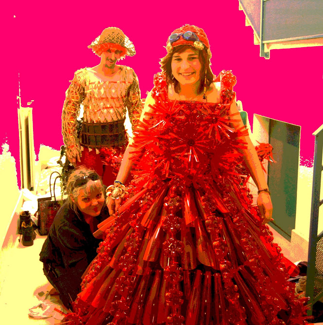 (le pied rouge et sa sirène ) une bouteille à la mer... costume réalisé en bouteilles de plastique ( 250 bouteilles environ) 6000 nœuds de laines, et plus de 600 œillets Merci à La jolie sirène et son marin